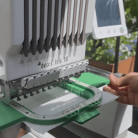 The MaggieFrame contains embroidery hoop magnets and has a large grain-textured contact surface, both of which assist in holding the fabric securely and ensuring even tension.