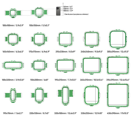 - The actual embroidery area will be smaller by 15mm / 0.6″. (depending on the brand of machine)